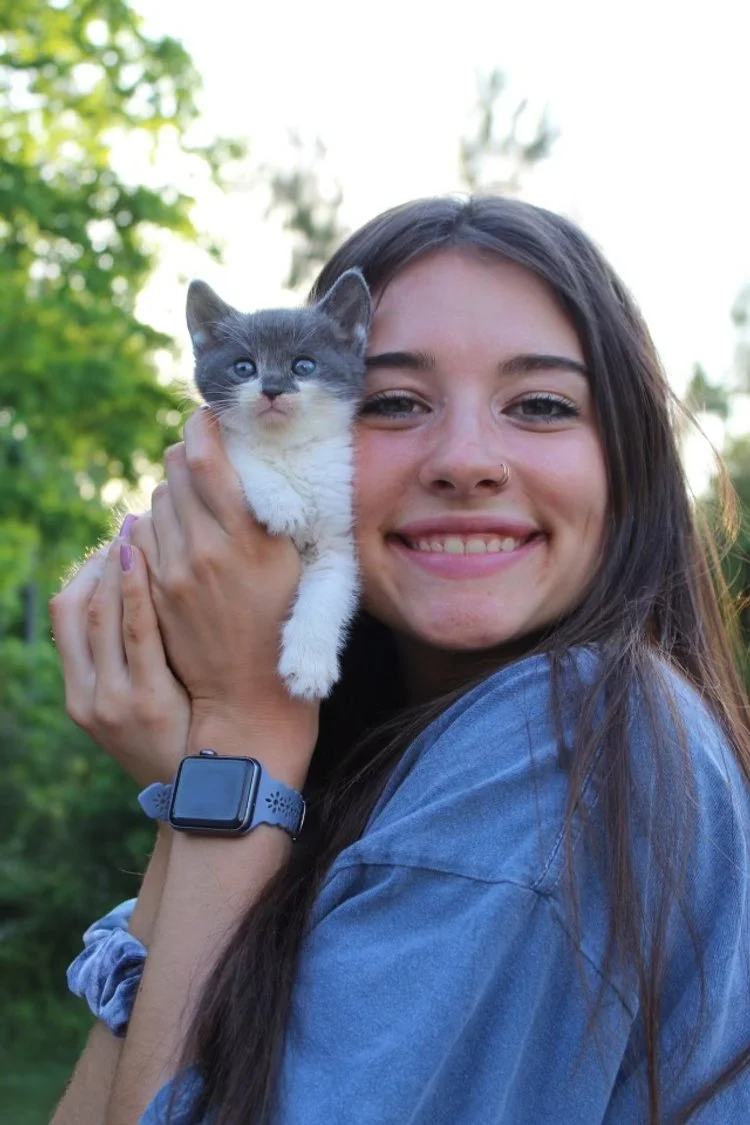 Summer of 2023 a friend reached out to me because she had found a tiny grey and white kitten all alone under a tire in her neighborhood. She had been looking after him for a few days but ultimately couldn’t keep him. Immediately I knew that he would be my best friend. I quickly ran to my car to pick him up and bring him to his forever home. It was love at first sight… the kitten was only 5 weeks old, far too young to be without his mom. I went to the store to get special kitten formula and a bottle and made a vet appointment for the following morning.